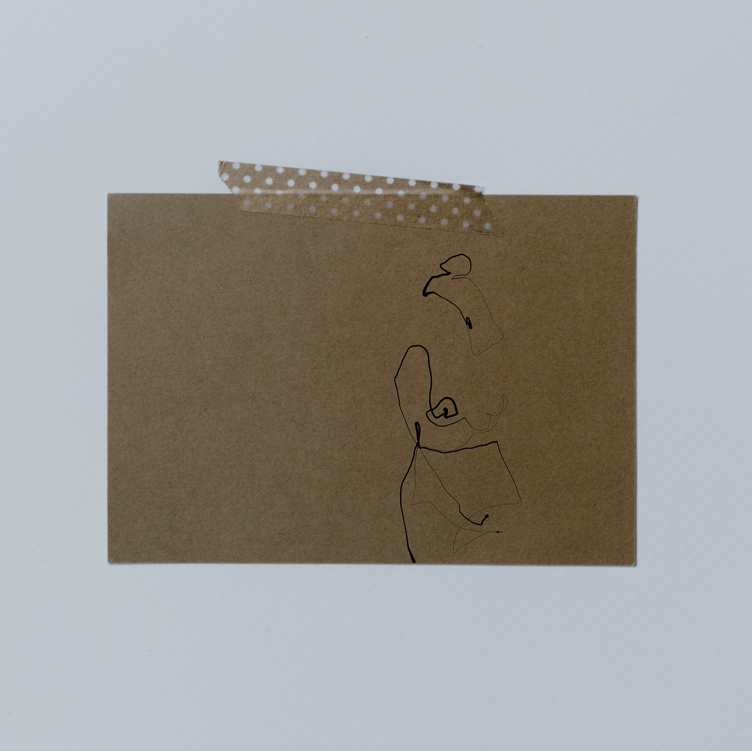 Postkarte aus Kraftkarton mit Tape an der Wand befestigt. Postkarte zeigt filigrane one line illustration einer nakten Frau