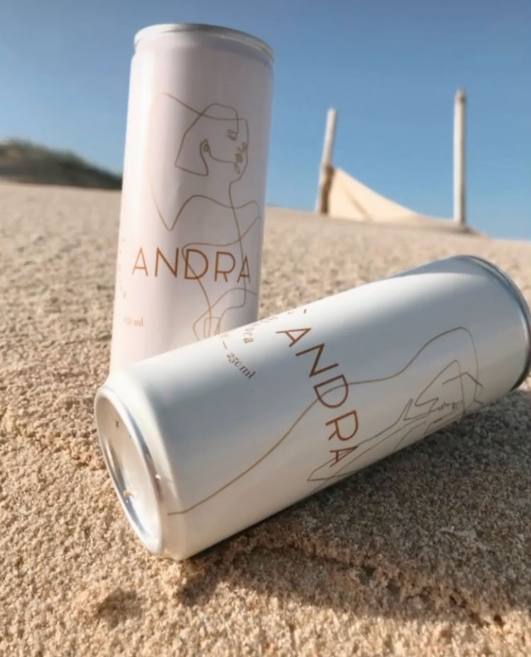 Andra Wine. Zwei Dosen gefüllt mit Rosé und Weißwein, im Sand liegend und von der Sonne angelacht.