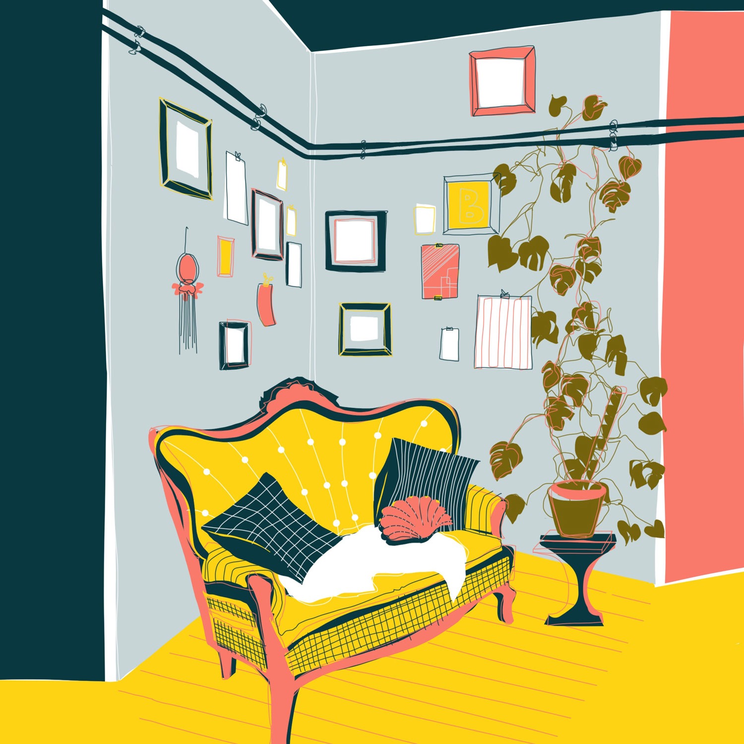Illustration eines Zimmer mit gelbem Sofa, einer großen Monstera-Pflanze und vielen Bildern an einer hellblauen Wand.