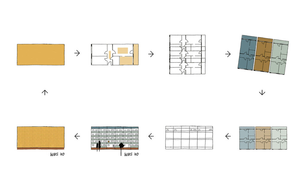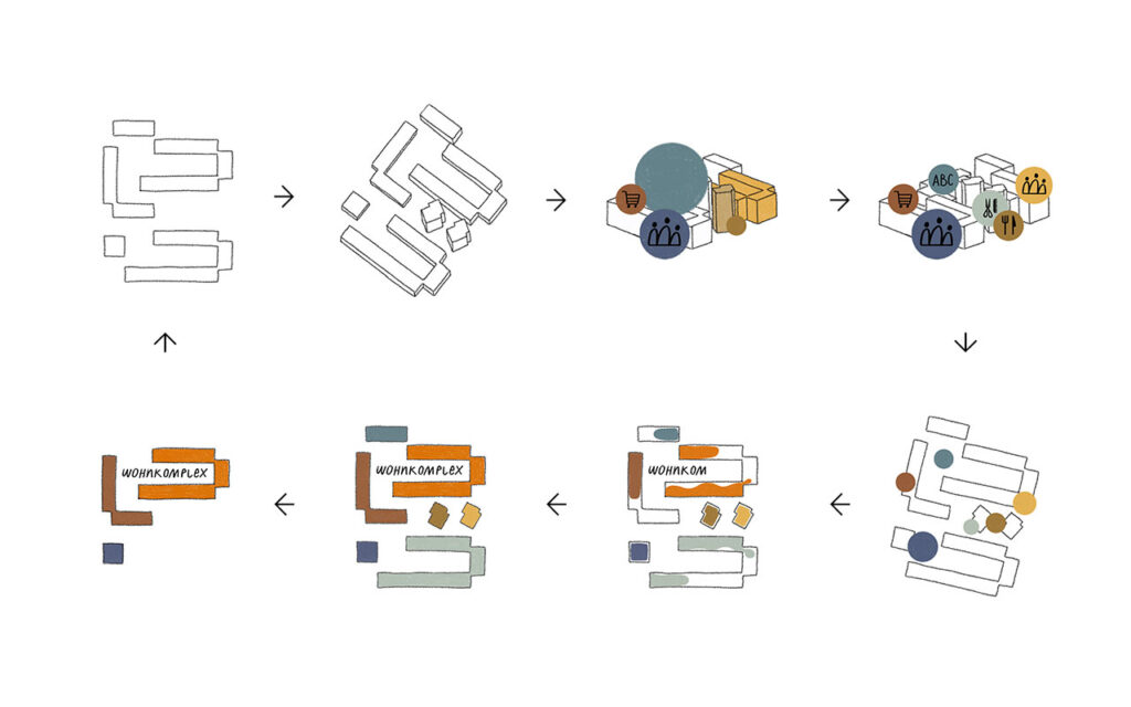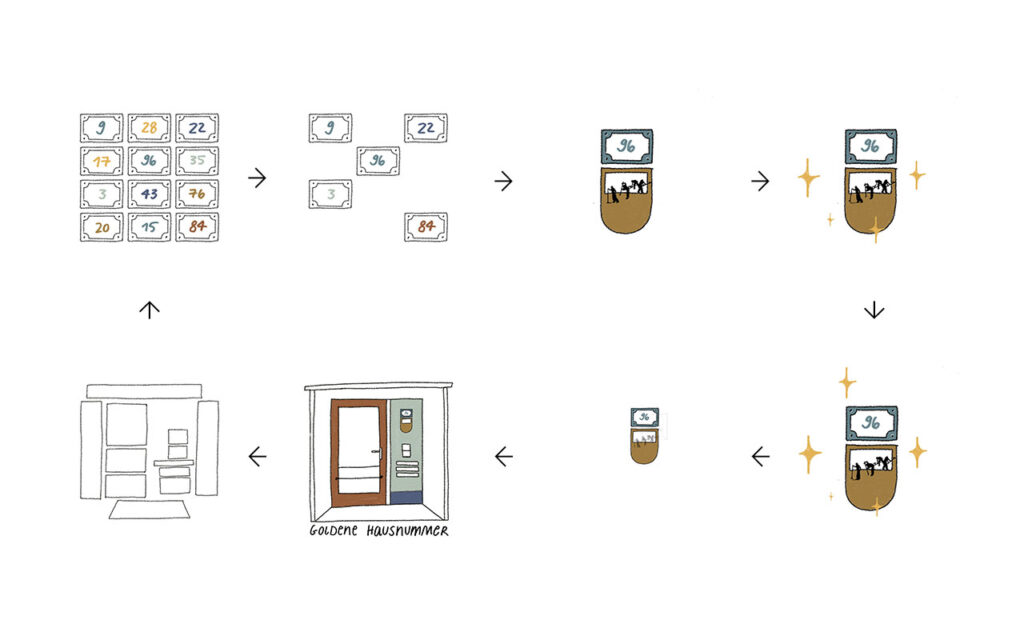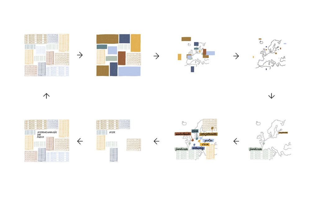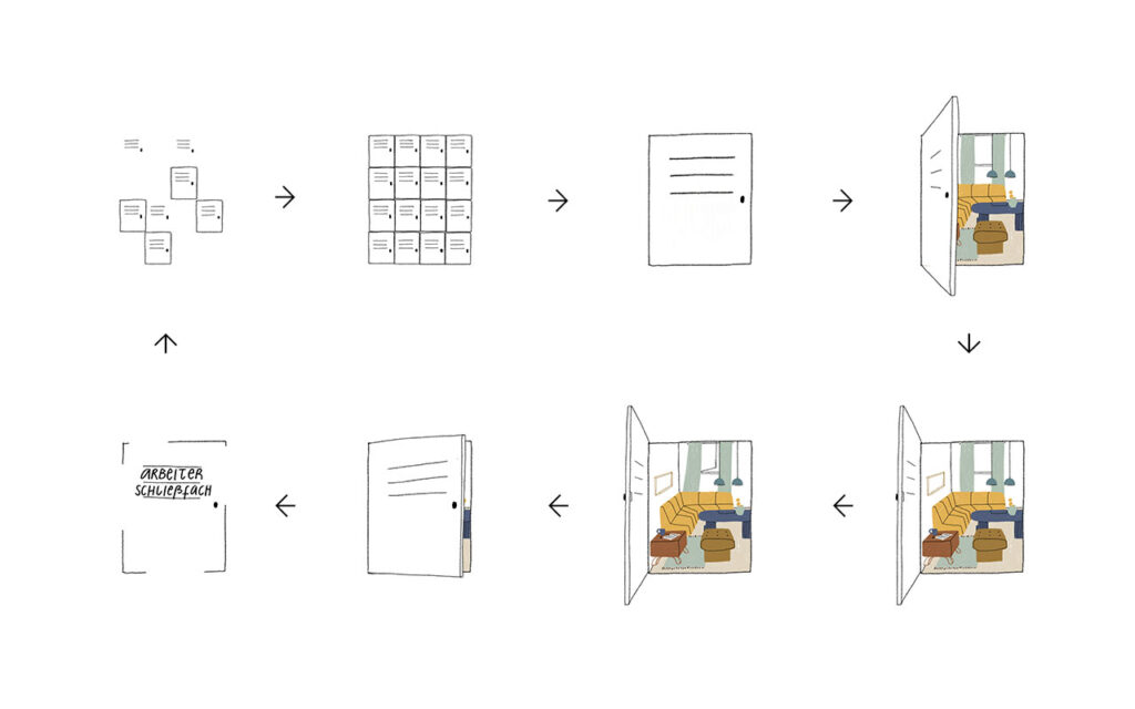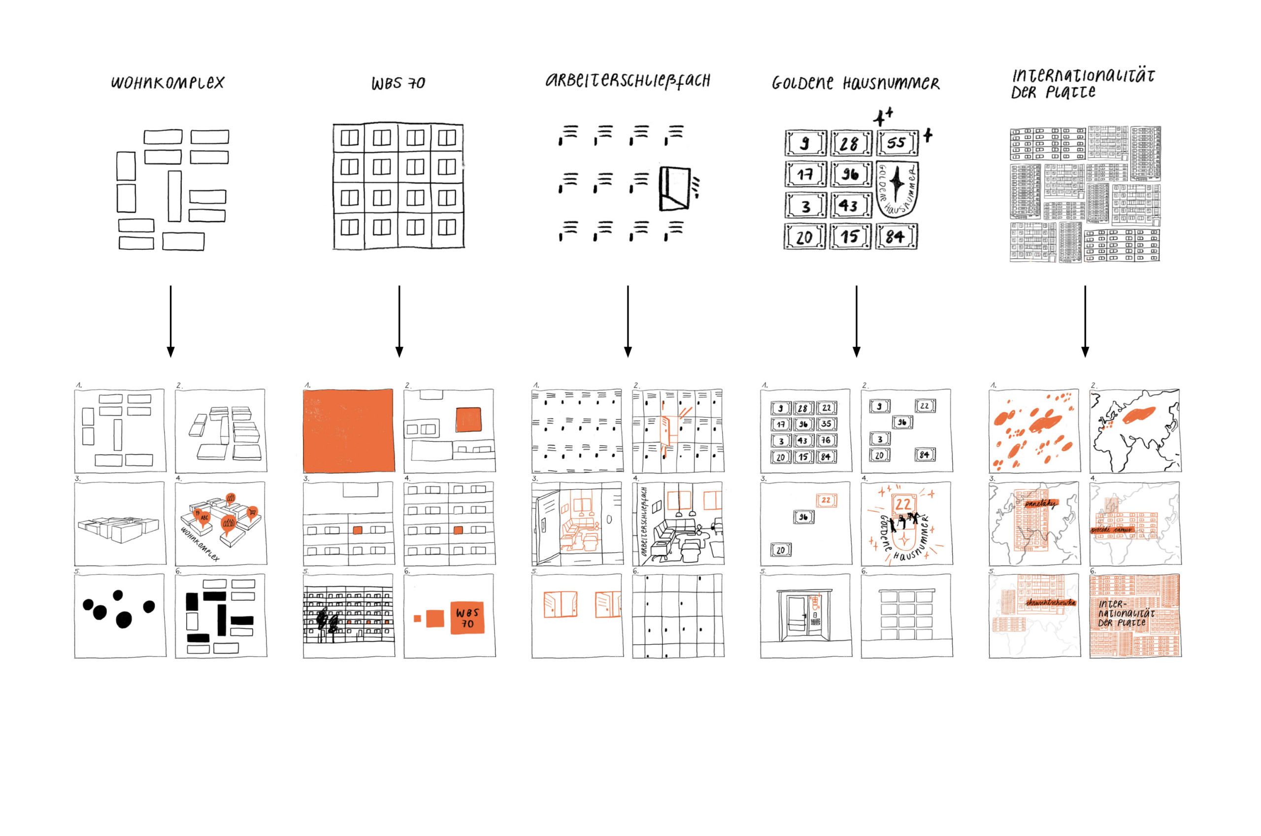 Illustration: Gestaltung von fünf Motiven zu den Glossarbegriffen Wohnkomplex, WBS 70, Arbeiterschließfach, Goldene Hausnummer und Internationalität der Platte.