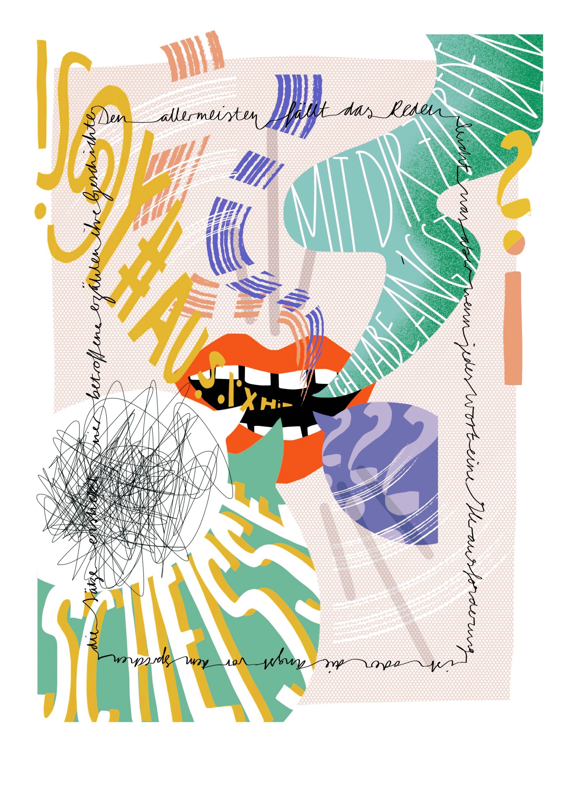 Illustration eines roten offenen Mundes, aus dem viele Sprechblase, wirre Formen und Buchstaben und Laute kommen. Darstellung von Redestörungen.