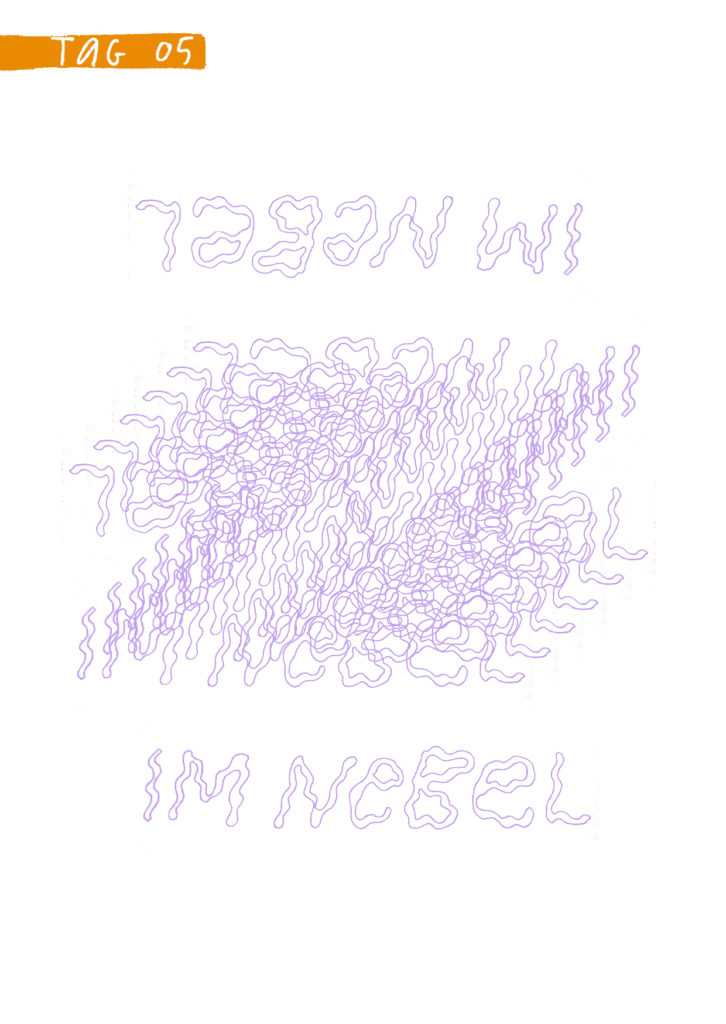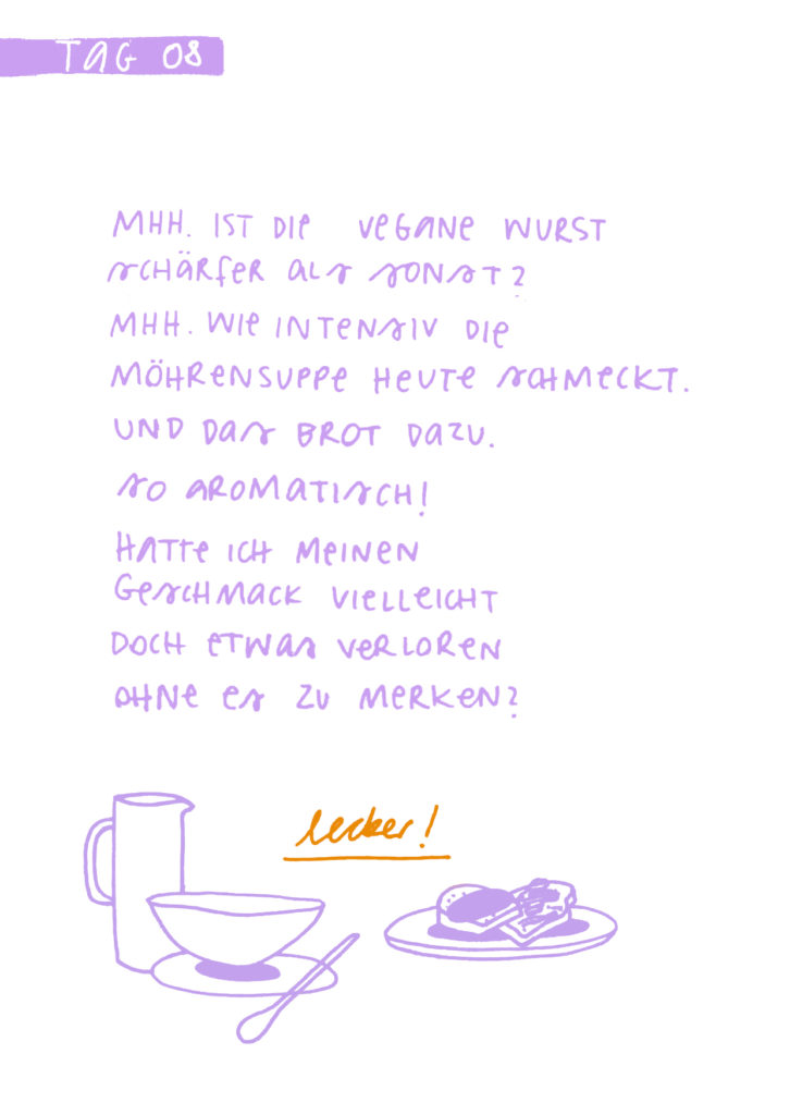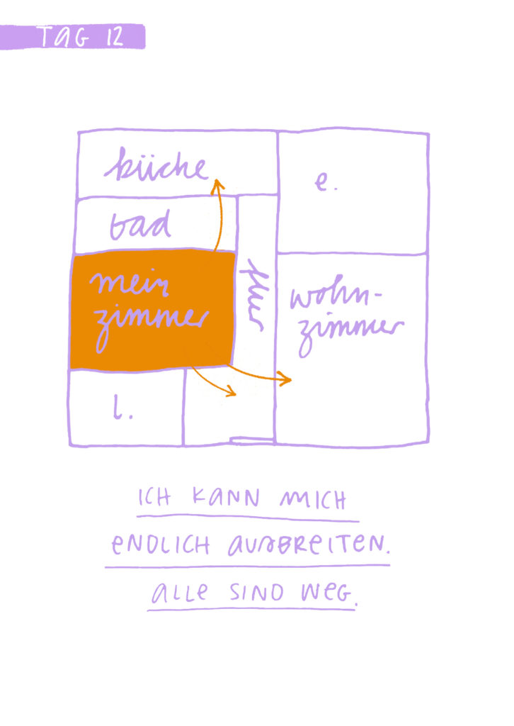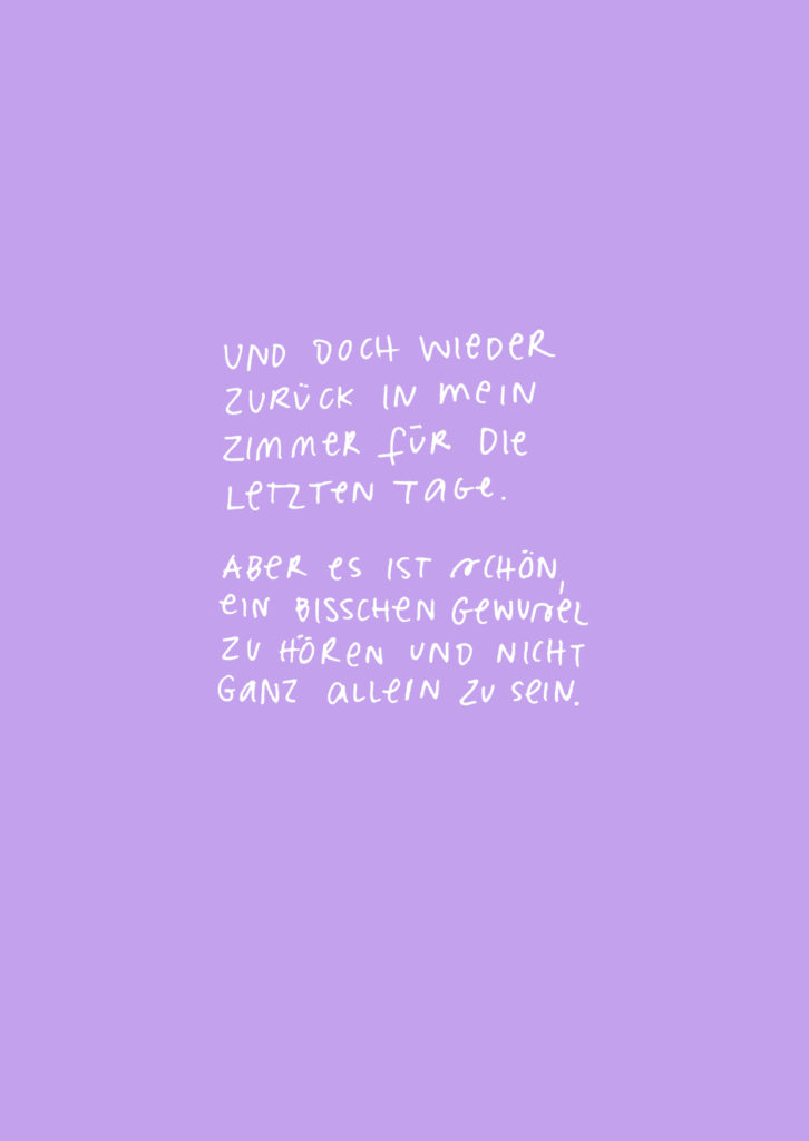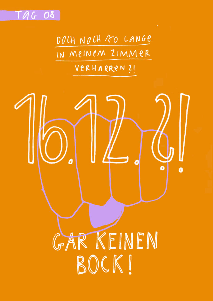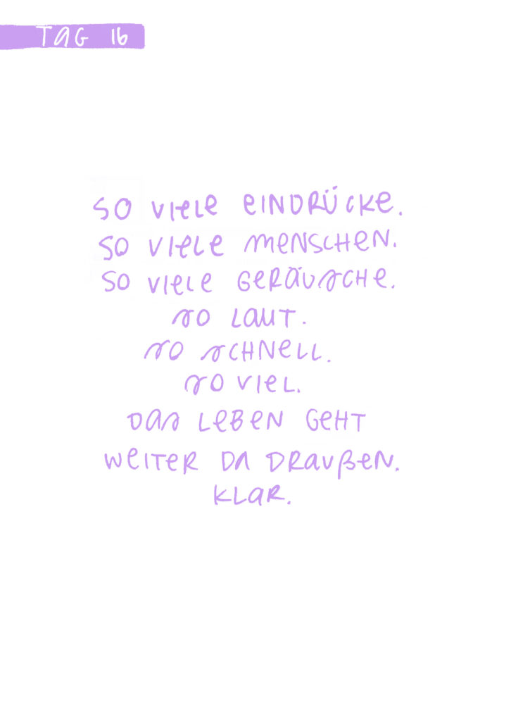 Diese Seiten sind eine Dokumentation meiner 16-tägigen Quarantäne aufgrund von Covid im Dezember 2021. Das Aufschreiben und Zeichnen meiner Gefühle und Gedanken half mir mit der Situation umzugehen. Es war eine feste Aufgabe, der ich mich jeden Tag bewusst widmete.