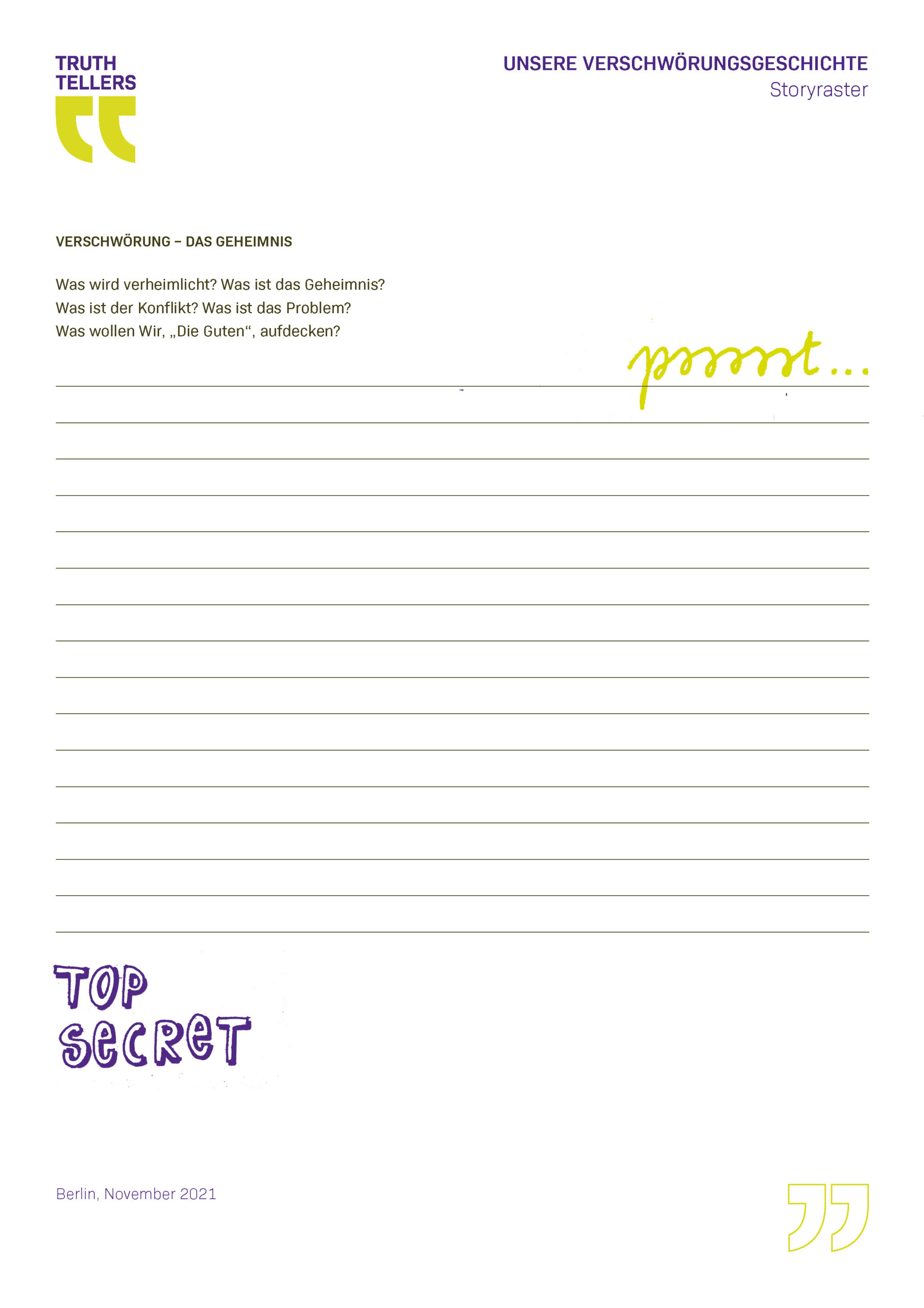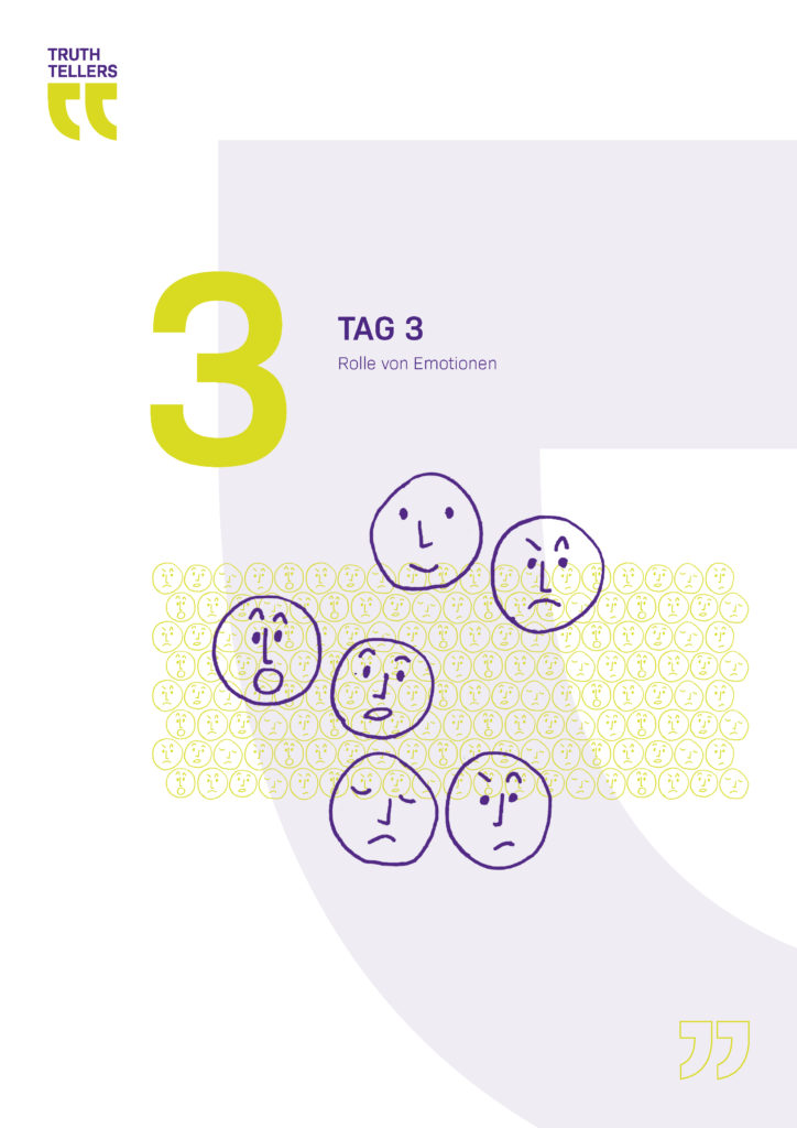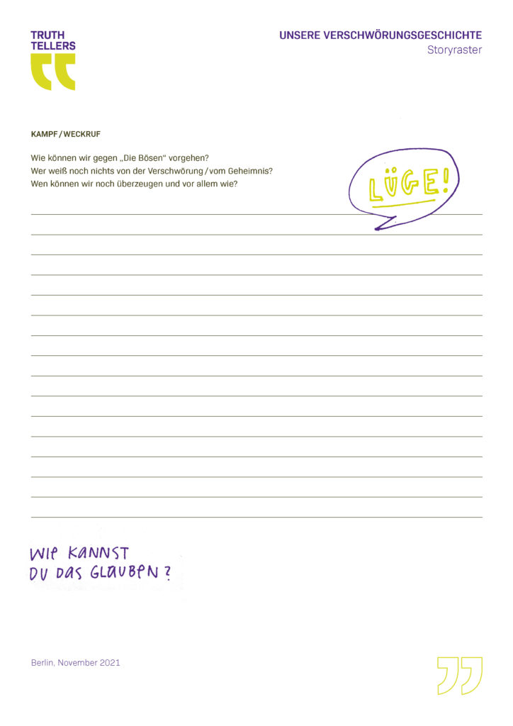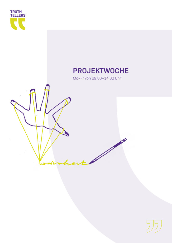 Im Projekt Truth Teller geht es zunächst einmal um folgendes: Drei Berliner Schulklassen der 8. und 9. Jahrgangsstufe haben sich in mehreren Moduleinheiten mit den Themen Wahrheit, Erzählungen und Ideologien auseinandergesetzt, um so für Verschwörungserzählungen und Fake News sensibilisiert zu werden. Die Jugendlichen haben reflektiert, welche bedeutende Rolle Erzählungen, Glaube und Gefühle spielen, um Menschen für das eigene Weltbild, „die eigene Wahrheit“, zu überzeugen.