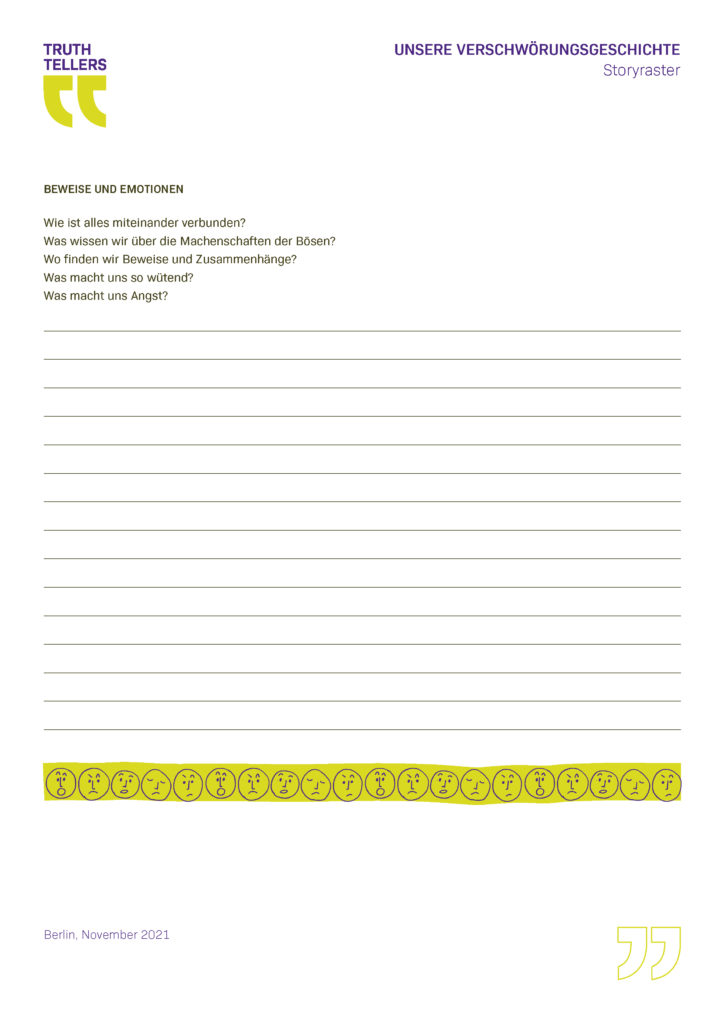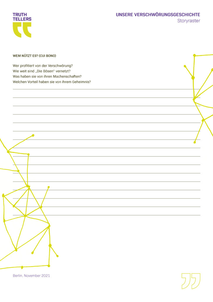 Während des Projektverlaufs entwickelten die jungen Teilnehmenden selbst eine Verschwörungsgeschichte und bedienten sich dabei, unterstützt durch den Einsatz digitaler Tools, verschiedener Formen des Storytellings und medialer Stilmittel der Emotionalisierung, um die Bedeutung von Narrativen und die Kraft des Erzählens selbstwirksam zu erfahren.