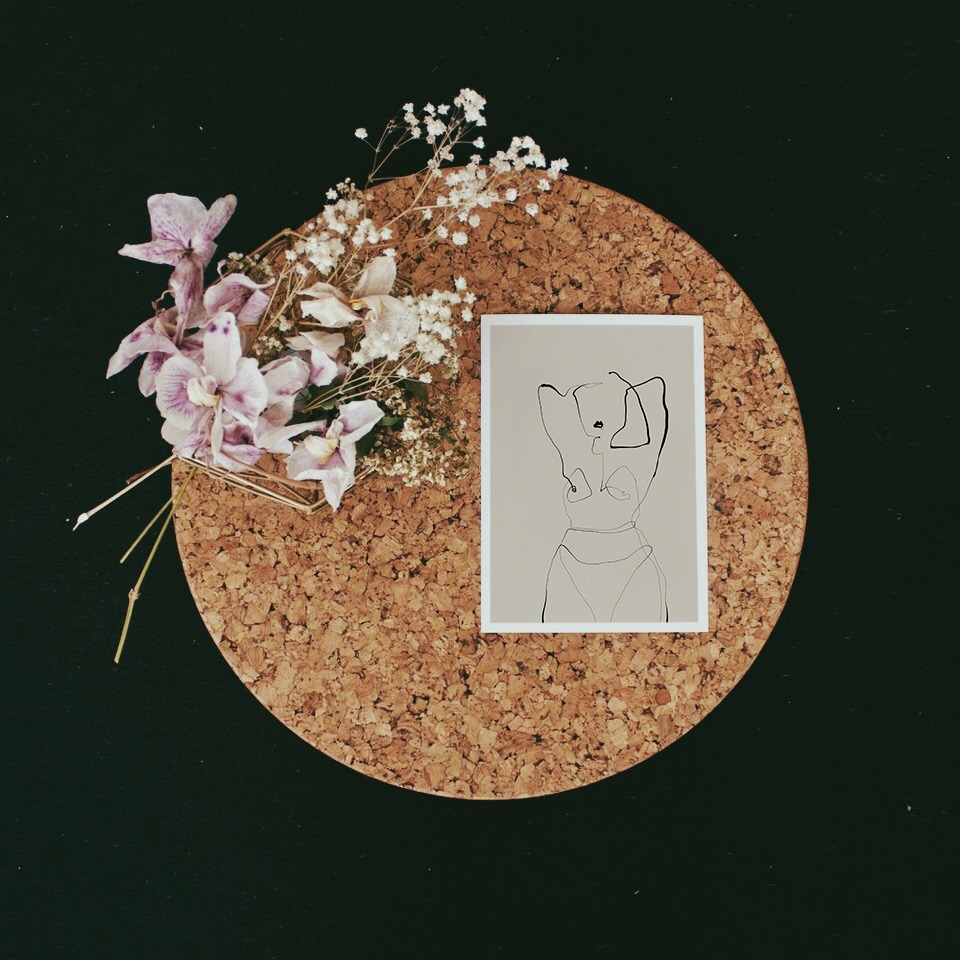 Postkarte liegt auf einem runden Korktablet mit Blumen daneben. Postkarte zeigt filigrane one line illustration einer nakten Frau.